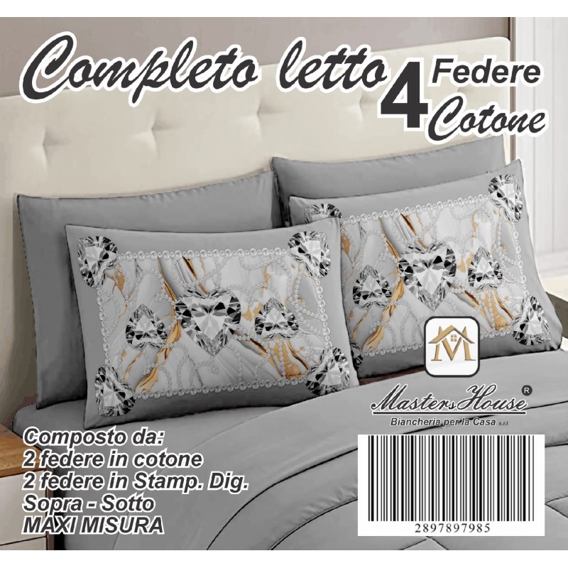 Set Completo: Include due lenzuola (una di sopra e una di sotto) e quattro federe (due in cotone e due con stampa digitale), perfetto per rinnovare completamente il look del tuo letto.