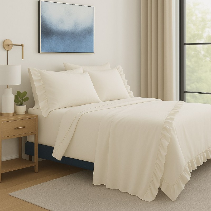 Completo letto in puro cotone color avorio con eleganti balze decorative. Set composto da lenzuolo di sopra con volant arricciate, lenzuolo con angoli e federe coordinate. Tessuto morbido e traspirante per un comfort ottimale. Design classico e raffinato che dona alla camera da letto un'atmosfera luminosa e accogliente in ogni stagione.