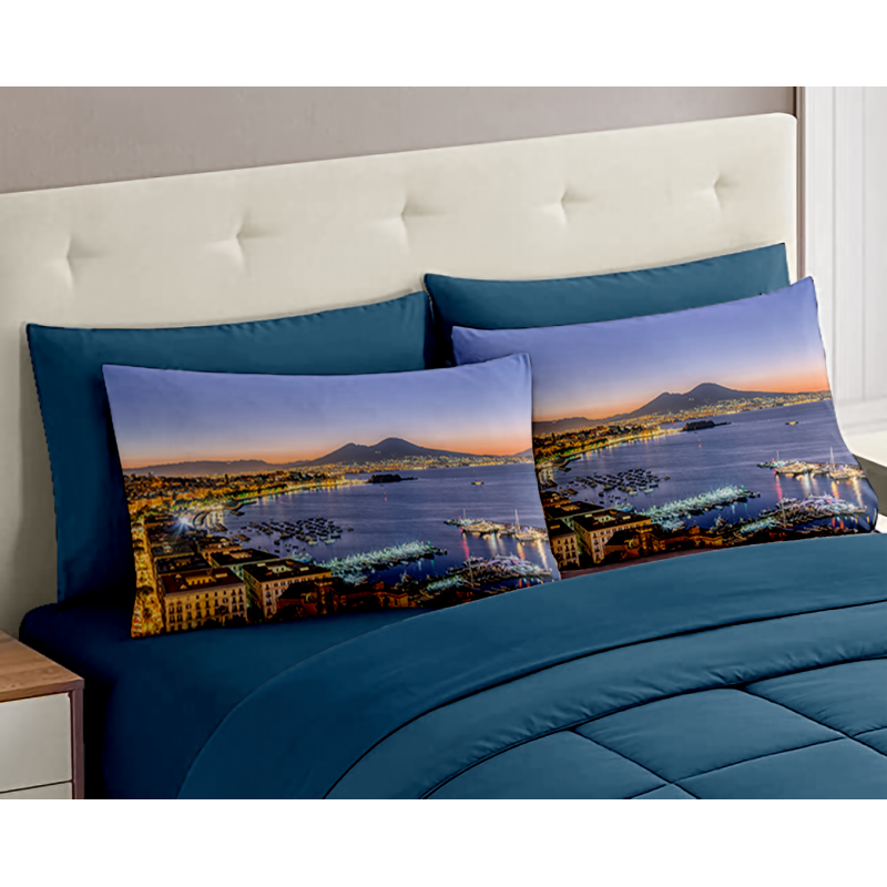 Set Completo Letto Matrimoniale dis. Golfo Napoli - 100% Cotone con Angoli a Molla e Federe Digitali Omaggio