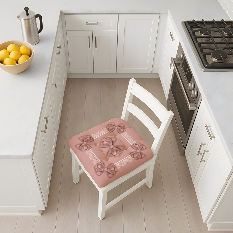 BULLET POINT 1 🎀 Coppia di cuscini per sedia con raffinati decori a fiocchi in rilievo e cornice a pizzo. Il design romantico e femminile trasforma ogni sedia in un elegante elemento d'arredo per cucina e sala da pranzo.