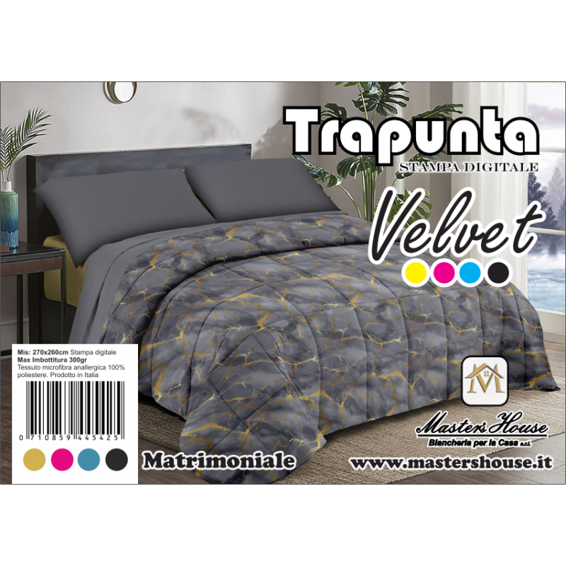 Aggiungi un tocco di lusso alla tua camera da letto con la trapunta matrimoniale marmorizzata in velluto. Realizzata con un tessuto vellutato morbido e pregiato, questa trapunta offre un comfort senza pari e un’estetica raffinata grazie alla stampa digitale effetto marmo. La sua imbottitura calda la rende ideale per le notti più fredde, avvolgendoti in un abbraccio soffice e rilassante. Lavabile e resistente, è perfetta per chi cerca un connubio di stile e funzionalità.