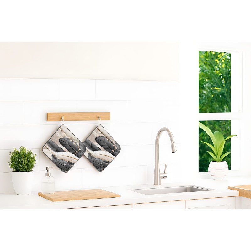 🌿 Design Esclusivo Tropical - Elegante stampa digitale con piume stilizzate e dettagli perle dorate che portano stile e raffinatezza nella tua cucina. Trasforma un semplice accessorio in un elemento decorativo di grande impatto.