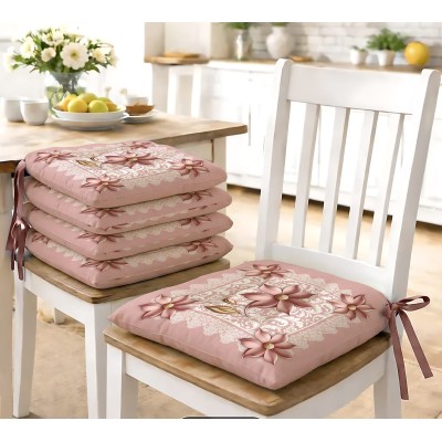 Set da 6 cuscini per sedia in morbida microfibra, con esclusivo motivo floreale effetto ceramica e lacci abbinati. Disponibile in tre eleganti colorazioni: Beige, Grigio e Rosa Antico. Perfetti per cucina, sala da pranzo e veranda.