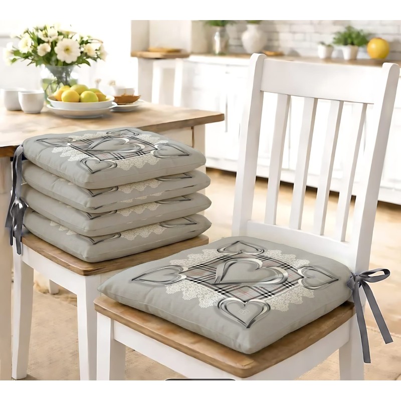 Rinnova la tua cucina o sala da pranzo con questo set da 6 cuscini per sedia dalla romantica stampa cuore 3D, arricchita da decori damascati, riquadro tartan e delicati motivi in pizzo. Lo stile country chic si esprime in tre varianti colore — beige, grigio e rosa — per adattarsi a qualsiasi ambiente e gusto decorativo. I pratici lacci di fissaggio mantengono ogni cuscino sempre stabile e in posizione sulla sedia. Realizzati in 100% poliestere, garantiscono morbidezza, resistenza e semplicità di lavaggio, mantenendo colori e decorazioni inalterati nel tempo.