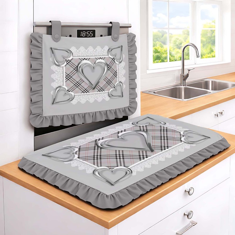 Completa la tua cucina con questo elegante set coordinato della Linea Cuore, composto da copriforno con ganci di fissaggio e copri fornello con balza decorativa. Entrambi i pezzi condividono la stessa raffinata stampa cuore 3D con riquadro tartan e delicati decori in pizzo bianco, garantendo un effetto visivo armonioso e di grande carattere. Disponibile in tre varianti colore — beige, grigio e rosa — si adatta a qualsiasi stile d'arredo. Realizzato in 100% poliestere, è morbido, resistente e semplice da lavare, mantenendo colori e decorazioni sempre vivaci nel tempo.