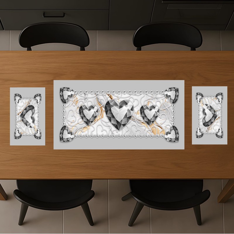 Tris da Tavola Linea Diamante Runner e 2 Tovagliette Cuori Gioiello – 100% Poliestere – 4 Colori