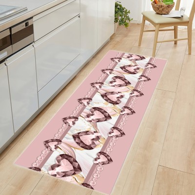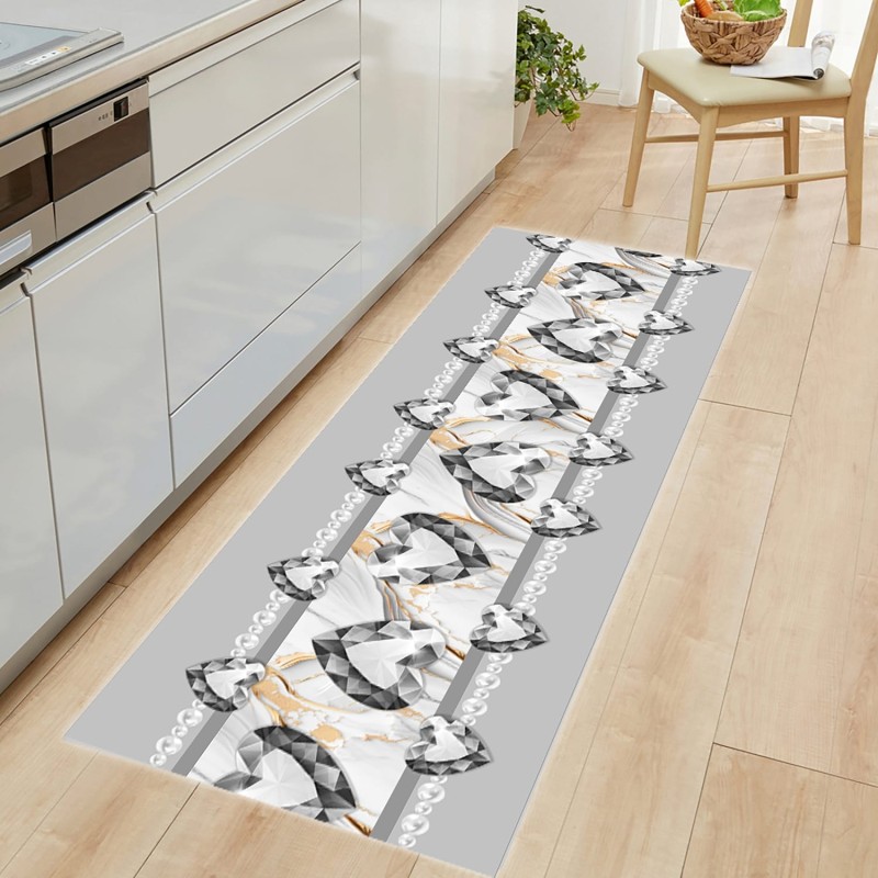 Aggiungi un tocco di lusso al pavimento della tua cucina con questo elegante tappeto runner della Linea Diamante, caratterizzato da una banda centrale con cuori sfaccettati a taglio diamante disposti in sequenza, strisce di perle laterali coordinate e sfondo marmorizzato con venature dorate. Il formato allungato lo rende perfetto davanti a fornelli, lavello o pensili. Disponibile in quattro varianti — beige, grigio, rosa e tiffany — si abbina perfettamente agli altri accessori della collezione. Realizzato in 100% poliestere, è morbido, resistente e semplice da lavare.