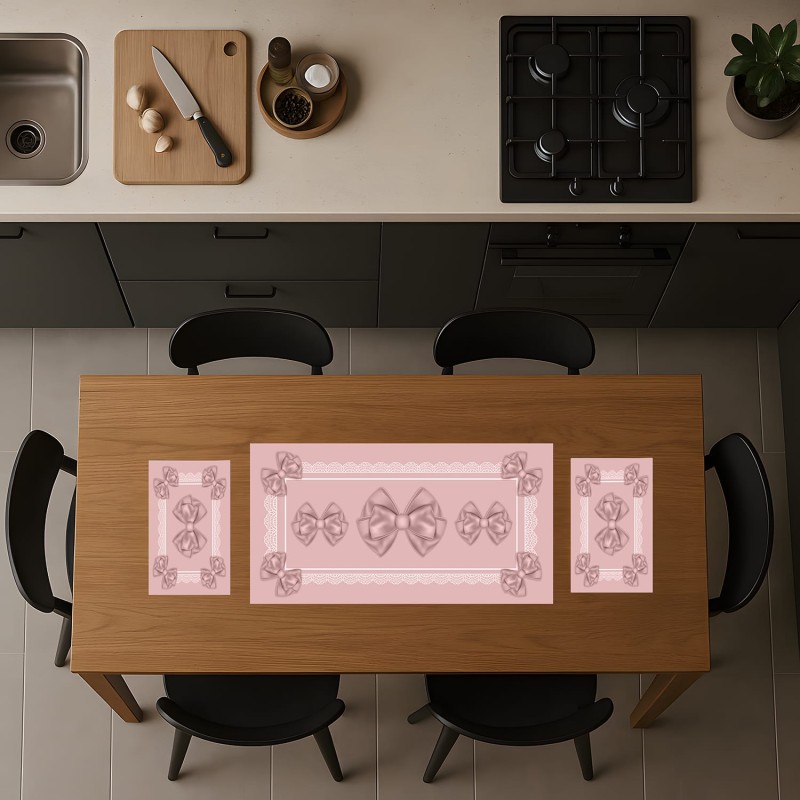 🎀 Set tris composto da un runner centrale e due sottopiatti laterali con raffinati fiocchi in rilievo e bordura a pizzo. Il design romantico e coordinato trasforma la tavola in un elegante elemento d'arredo.