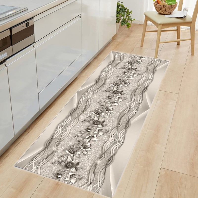 Arricchisci la tua cucina con il tappeto passatoia della Linea Iron, disponibile nella misura [XX x XX cm] in 100% poliestere. La raffinata stampa digitale 3D ad alta definizione riproduce una cascata floreale tridimensionale con fiori metallici e cornice ornamentale intrecciata con effetto glitter scintillante, disponibile in tre varianti colore: grigio argento, rosa cipria e oro. Il fondo antiscivolo garantisce stabilità e sicurezza durante l'uso quotidiano, mentre il materiale morbido e lavabile assicura una manutenzione semplice e rapida. Abbinalo agli altri accessori della Linea Iron per un coordinato cucina di grande effetto e stile.