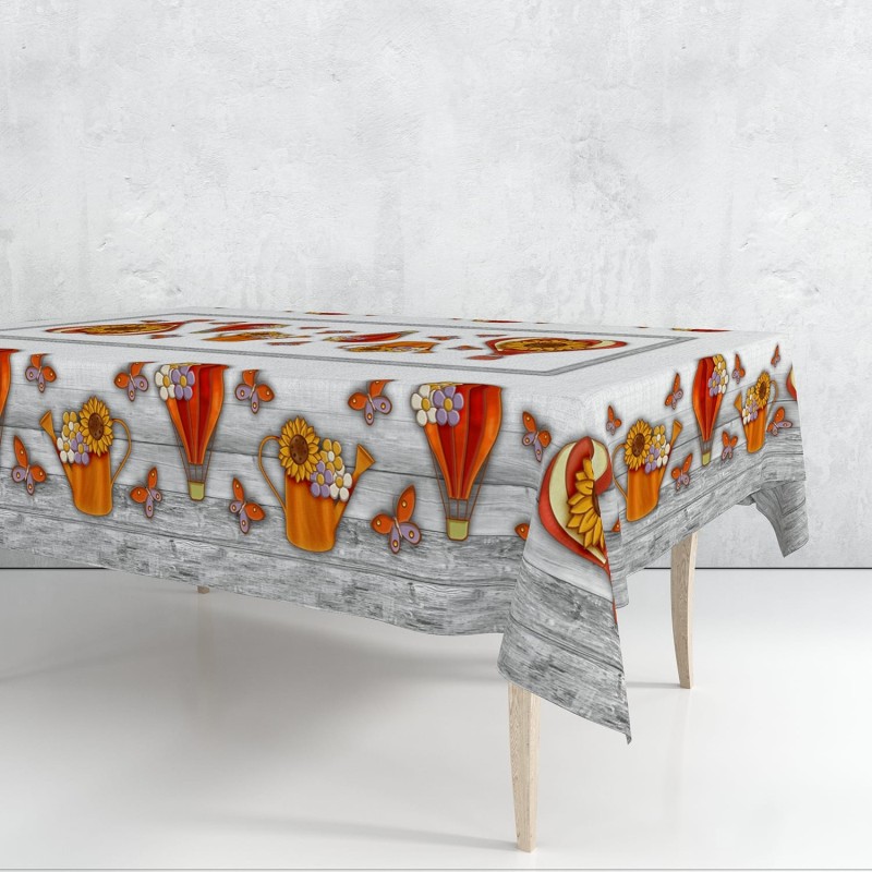 La tovaglia Linea Mongolfiera porta in tavola tutta la gioia e il calore dello stile shabby chic. La ricca stampa digitale raffigura mongolfiere colorate, annaffiatoi fioriti, girasoli e farfalle su uno sfondo con texture effetto legno naturale, creando un effetto visivo caldo e accogliente. Nel formato da 180x145 cm, è pensata per tavoli da 6 posti e si adatta perfettamente sia ai pranzi quotidiani che alle occasioni speciali. Realizzata in 100% poliestere resistente e di semplice manutenzione, è disponibile nelle varianti beige e grigio per coordinarsi con tutti gli accessori della Linea Mongolfiera.