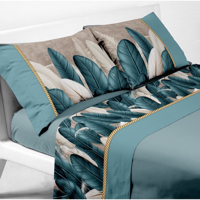 Completo Lenzuola Tropical Piume Balza Raso Cordoncino Oro - Stampa Digitale Poliestere Vari Colori