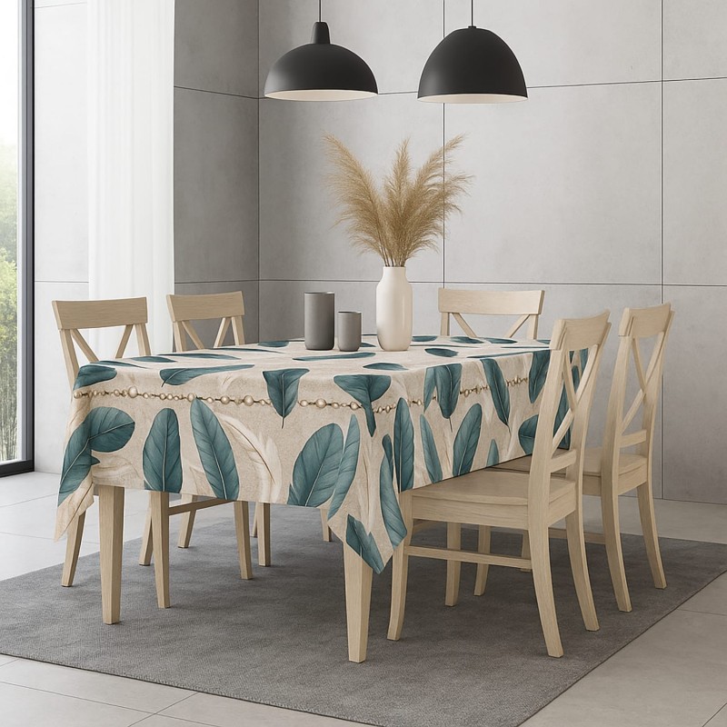 Tovaglia 6 Posti 180x145 cm Stampa Foglie Tropicali con Perle – 100% Poliestere Linea Tropical