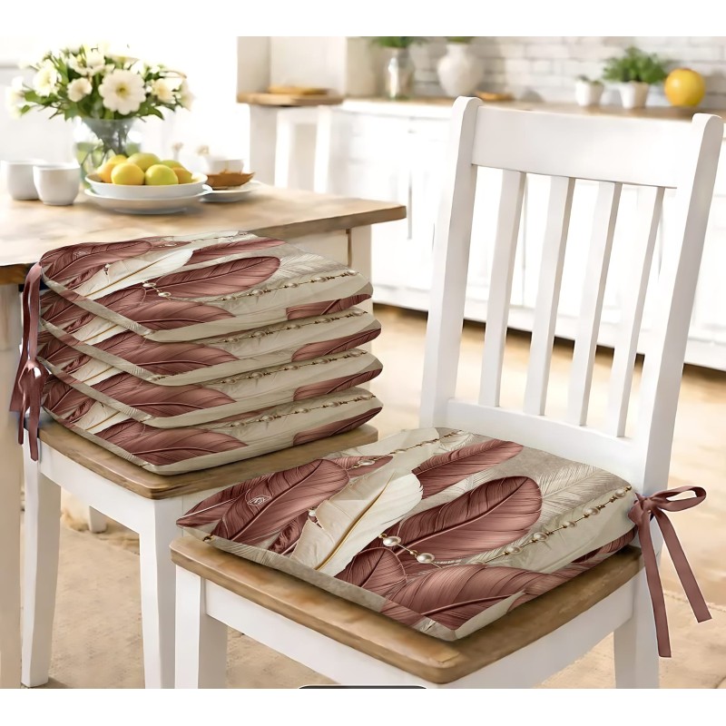 I cuscini per sedia della Linea Tropical con motivo a piume e perle trasformano ogni ambiente con eleganza e stile boho-chic. Disponibili in 5 colorazioni – beige, grigio/tiffany, nero/grigio, rosa antico e tiffany – si adattano a qualsiasi arredo, dal classico al moderno. Il set da 6 pezzi in 100% poliestere garantisce comfort duraturo, morbidezza e praticità d'uso quotidiano. I lacci abbinati assicurano un ancoraggio stabile e preciso alla sedia. Dimensioni: 40x40 cm.