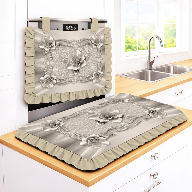 Set cucina copriforno e coprifornelli beige con stampa fiori effetto metallo e balze coordinate. Realizzato in microfibra 100% anallergica con stampa digitale 4K. Disponibile in 4 colori, offre protezione e design glamour Made in Italy per una cucina elegante e sempre curata.