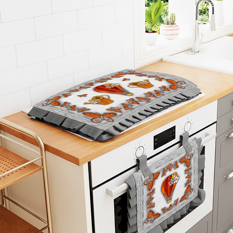 Trasforma la tua cucina con questo elegante set coordinato copriforno e coprifuochi in fantasia Mongolfiera. Il design romantico con mongolfiere, farfalle arancioni e girasoli su fondo grigio dona allegria e personalità all'ambiente. Realizzato in Italia in morbida microfibra, protegge forno e piano cottura da polvere e graffi con stile raffinato.