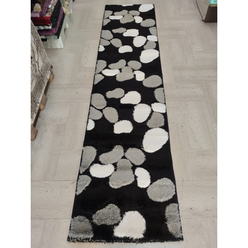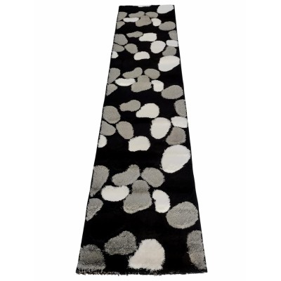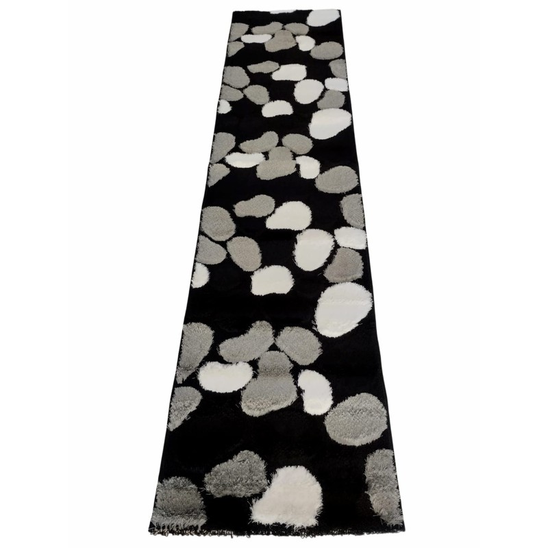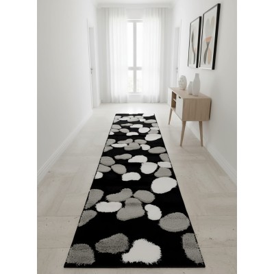 La passatoia moderna "Macchie" è un tappeto da corridoio dal design attuale, con pelo alto e motivo onde e ciottoli nei toni nero, grigio e bianco. Morbido e resistente, è dotato di base antiscivolo ed è lavabile. Ideale per ambienti di passaggio come corridoi, disimpegni o ingressi. Misura 70x290 cm.