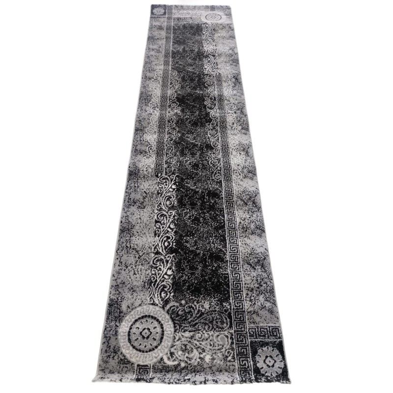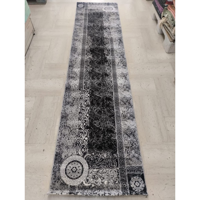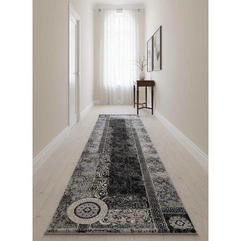 Passatoia 70x390 cm con elegante design greca geometrico in bianco, grigio e nero. Realizzata in polipropilene morbido ma resistente, è lavabile e dotata di base antiscivolo per la massima sicurezza. Perfetta per l’ingresso, il disimpegno o corridoi moderni e raffinati.