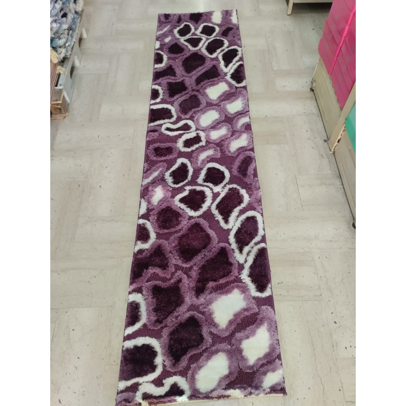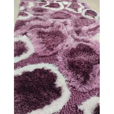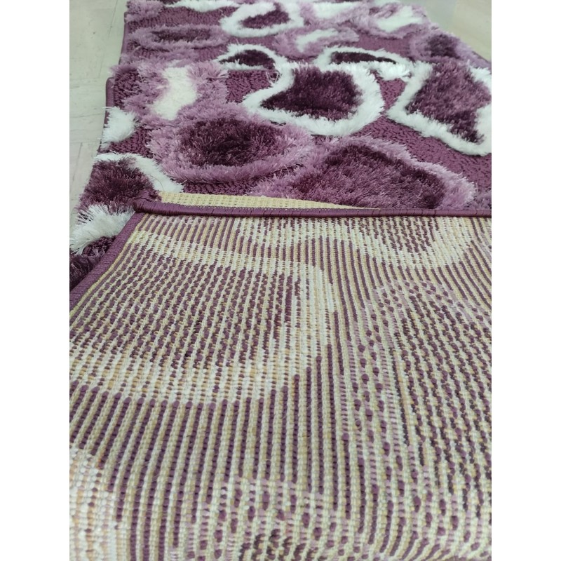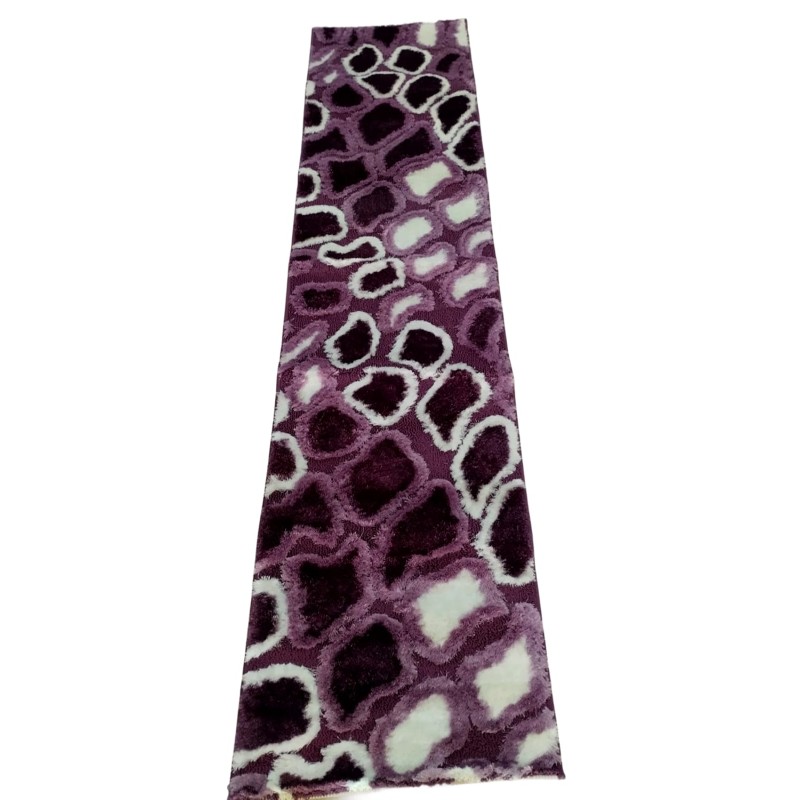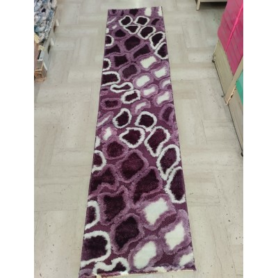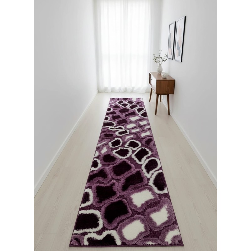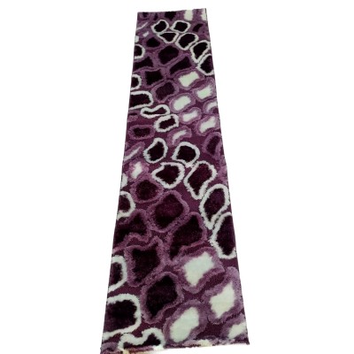 Passatoia moderna 70x290 cm in tonalità viola con design a onde, cerchi e forme bianche. Realizzata in polipropilene a pelo alto, è morbida, resistente e lavabile. Dotata di fondo antiscivolo, ideale per ingresso, disimpegno o corridoio, unisce estetica e praticità.
