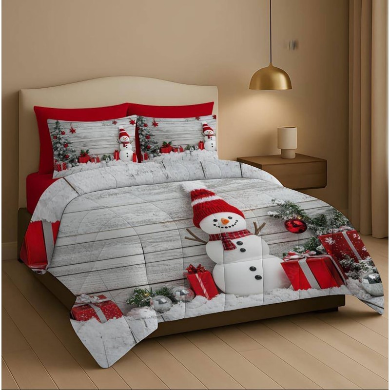 Trapunta Natalizia Matrimoniale –Pupazzo di neve,regali e albero su uno sfondo chiaro – Stile e Comfort per le Feste