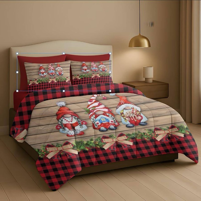 Trapunta Natalizia Matrimoniale – Stampa di gnomi su uno sfondo effetto legno– Stile e Comfort per le Feste