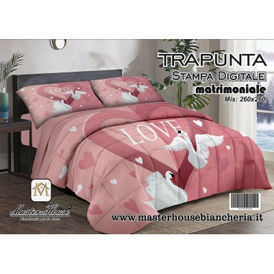 Immergiti nell'essenza dell'amore e della serenità con la nostra trapunta matrimoniale, un simbolo di affetto eterno rappresentato da cigni che si specchiano formando un cuore, sotto la dolce scritta "Love". Questa trapunta, di dimensioni generose 260x260 cm, è perfetta per abbellire il tuo letto matrimoniale, offrendo calore e comfort durante le notti più fresche. La stampa digitale di alta qualità assicura che i dettagli delicati e i colori vivaci restino vividi nel tempo, trasformando la tua camera da letto in un rifugio d'amore. Disponibile in vari colori, puoi scegliere il tono che meglio si adatta al tuo stile personale o all'arredamento della tua stanza.