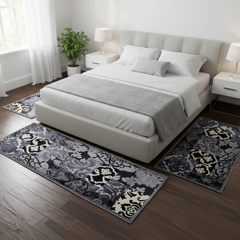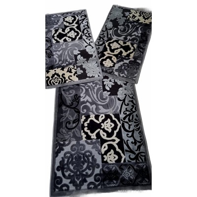 Rinnova la tua camera con questo elegante tris di tappeti dal design patchwork nei toni grigio e nero. I riquadri decorativi con motivi floreali e arabeschi creano un effetto moderno e raffinato. Set completo con tappeto 80x150 cm e due laterali 60x110 cm in polipropilene morbido antiscivolo.