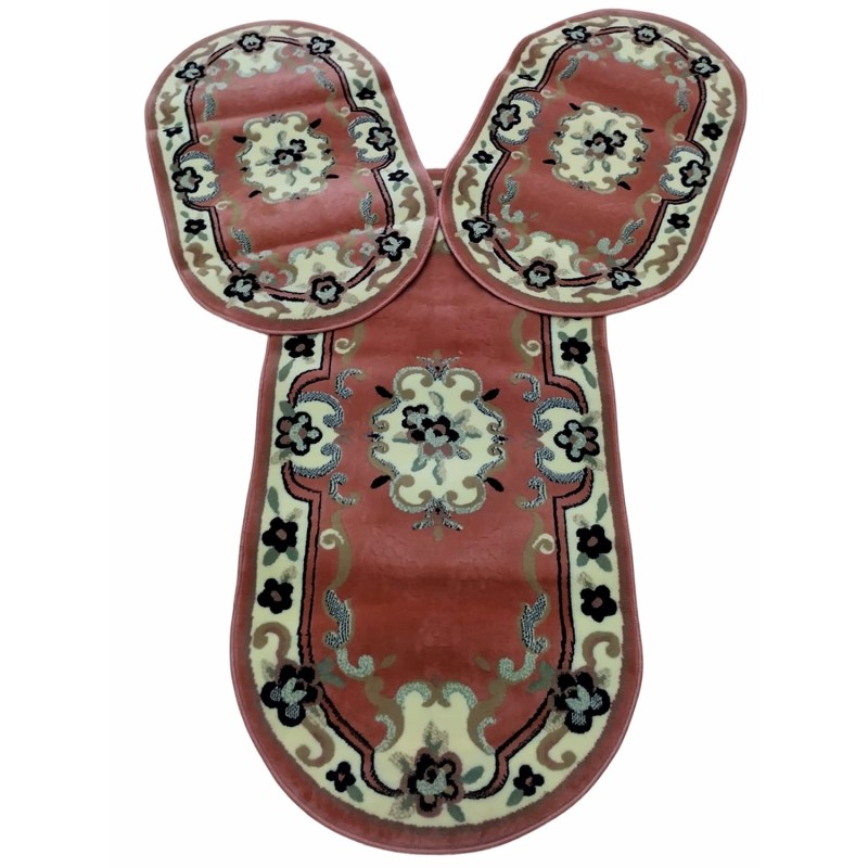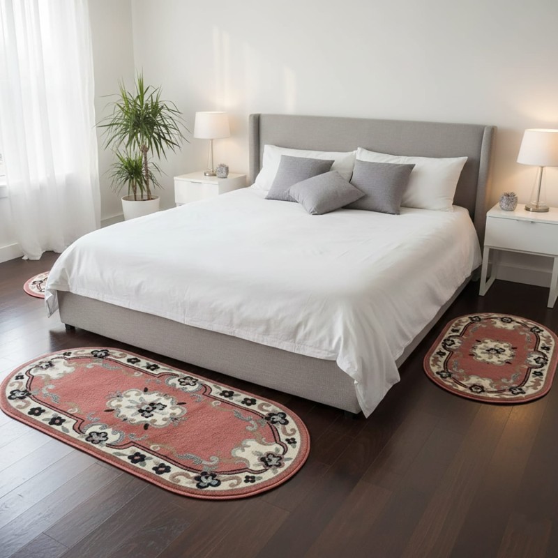 Arreda con eleganza classica la tua camera da letto con questo tris di tappeti ovali Cinos nei raffinati toni rosso e bordò. Il set include un tappeto fondo letto 70x140 cm e due laterali 60x100 cm in soffice polipropilene antiscivolo. Forma ovale distintiva per un ambiente dal fascino tradizionale.